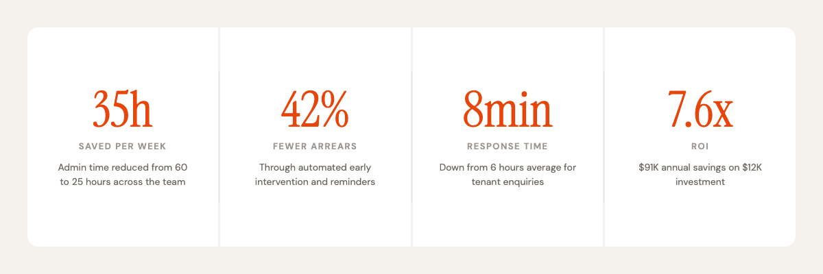 The financial case for AI automation in real estate is compelling. Here is what the numbers look like for a typical agency managing 200–500 properties with a team of 3–6 property managers and 2–4 sales agents.